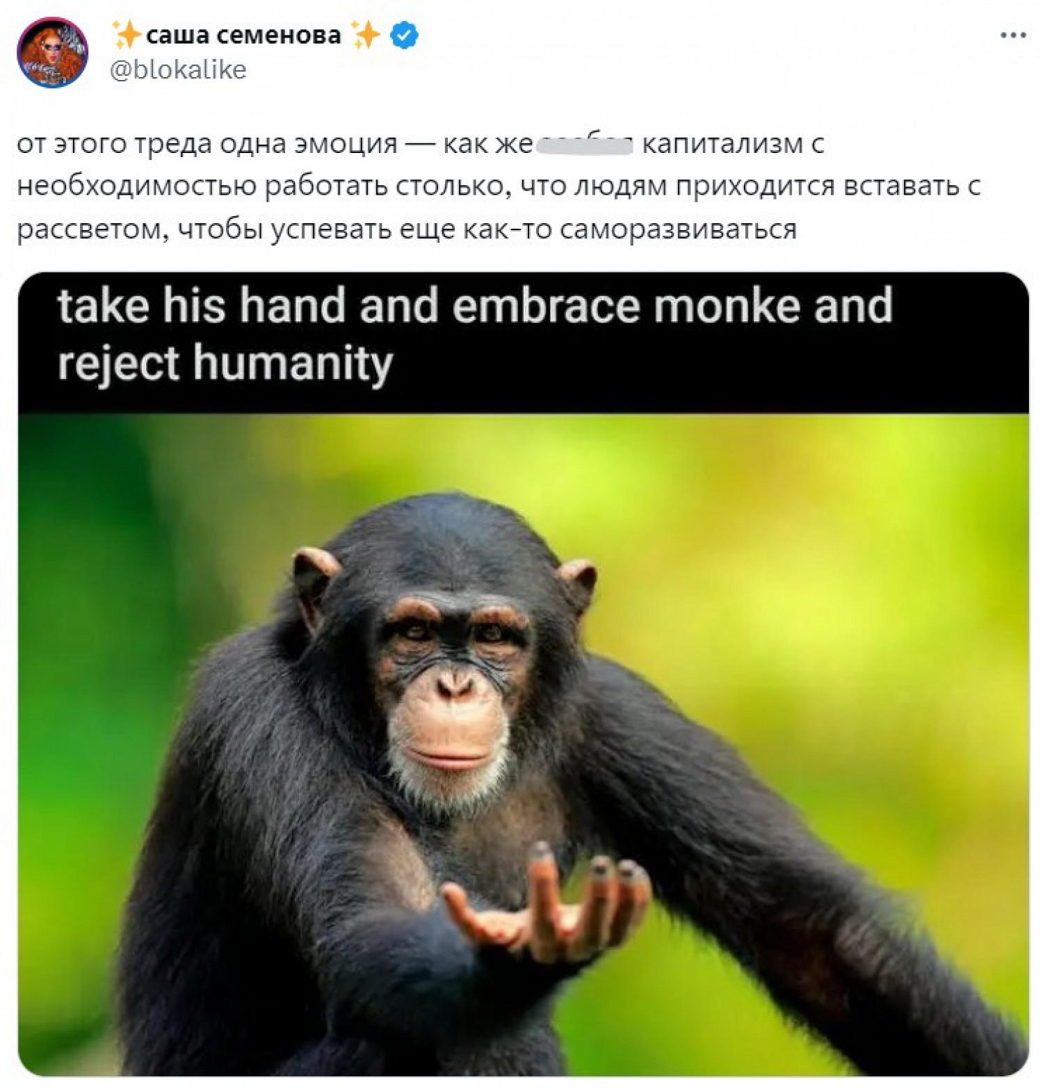 Текст на картинке: «Возьми руку, стань обезьяной и откажись от человечества»