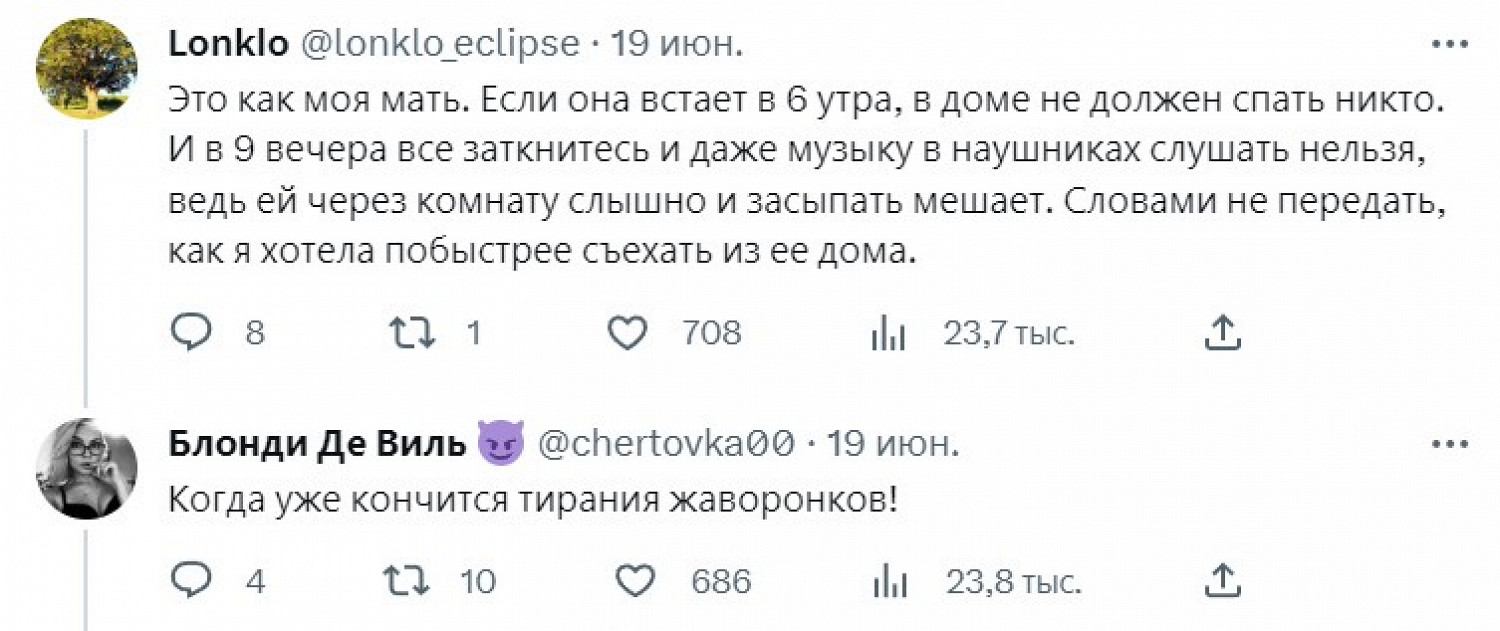 Так называемых сов, которые ложатся спать и просыпаются поздно, обвинили в лени: вместо сна большинство из них, по мнению одного из пользователей, выбирает просмотр сериалов до утра. «Именно эти совы в итоге бегают и орут, что жаворонки им жизнь заруинили [испортили]», — уверен он. Одна из сов ответила, что такой образ жизни не личный выбор, из‑за которого пришлось «страдать весь детсад, школу и универ».