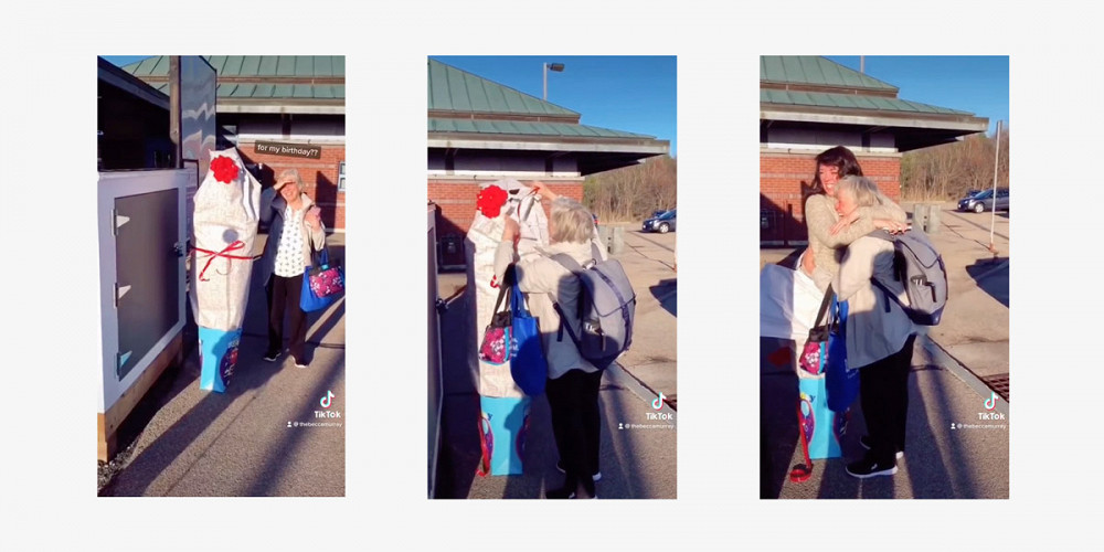 Следующий фрагмент тиктока снят уже самой @thebeccamurray, которая все это время и была «тайным подарком» и стояла с телефоном наготове. На несколько секунд в кадре появляется счастливое лицо женщины, смеющейся от восторга и неожиданности. Ролик заканчивается трогательными объятиями матери и дочери.