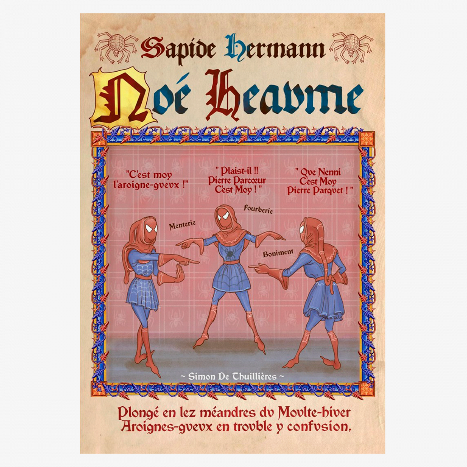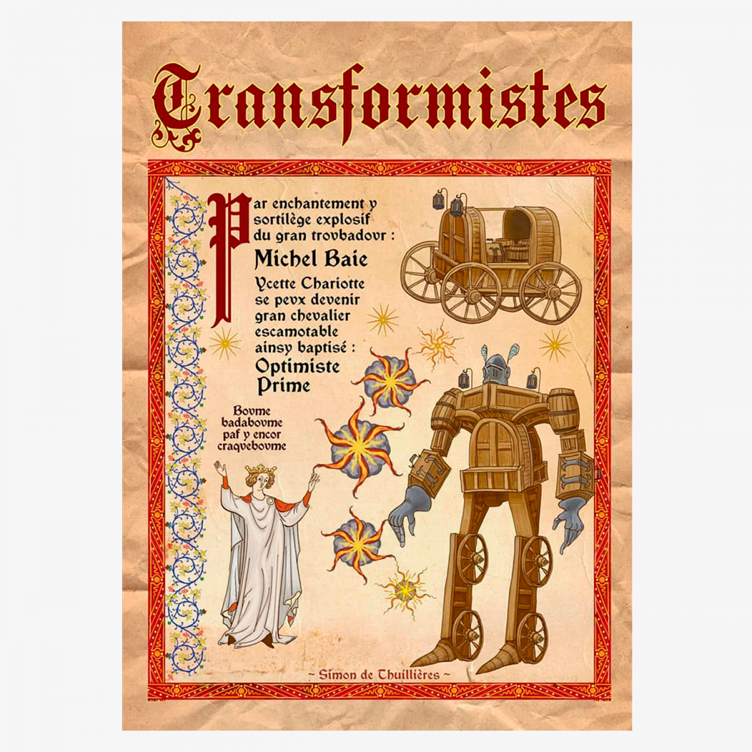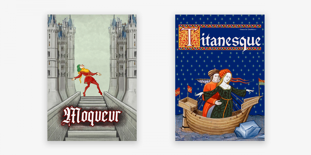 «Все должно максимально соответствовать средневековой эстетике: украшения, фризы, инициалы, а также изображение мест и персонажей, все это взято с миниатюр», — объясняет иллюстратор. К современным изобретениям вроде мобильных телефонов, компьютеров или космических кораблей ему приходится находить некие эквиваленты. Так, например, трансформеры стали деревянными, Годзилла принялся разрушать каменное поселение вместо мегаполиса, а Джек и Роза встретились не на огромном лайнере, а на ладье. Названия фильмов на этих афишах тоже выдержаны в средневековом стиле — они переведены на старофранцузский.