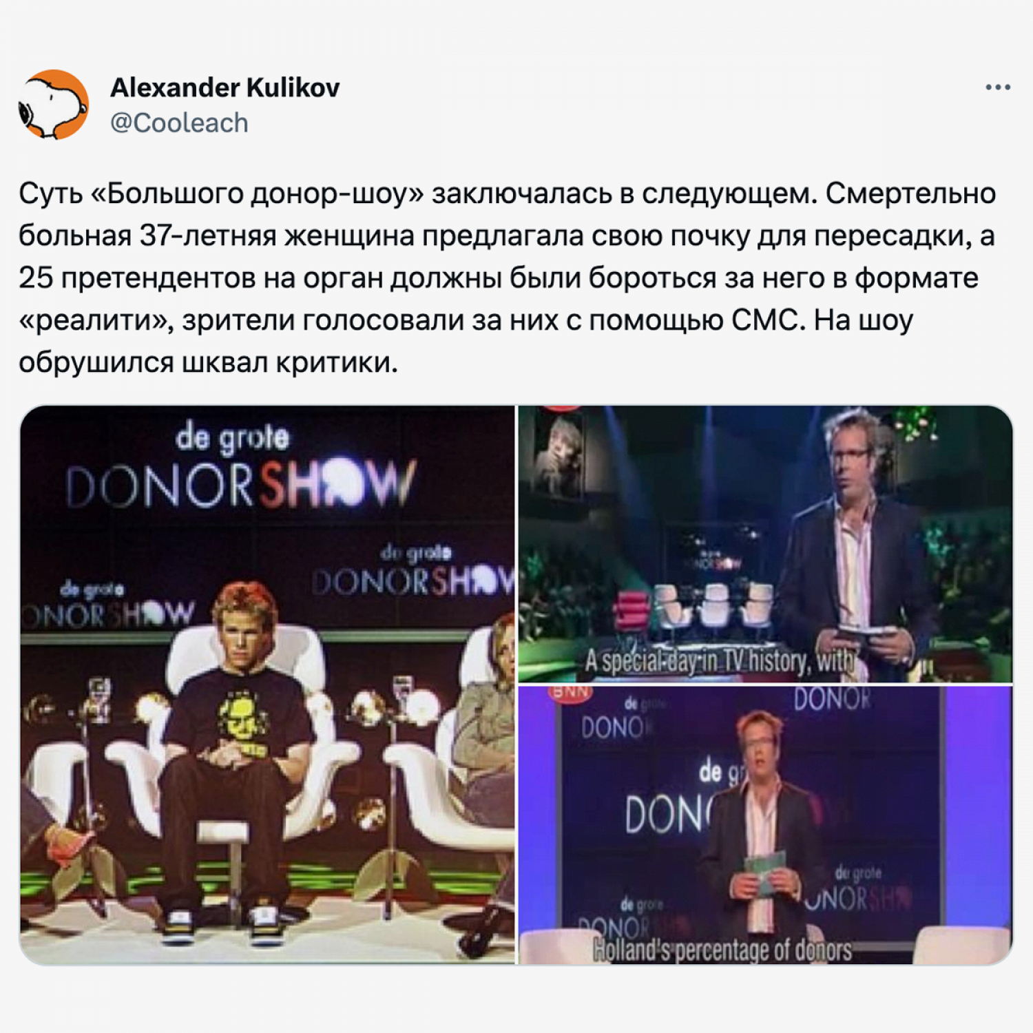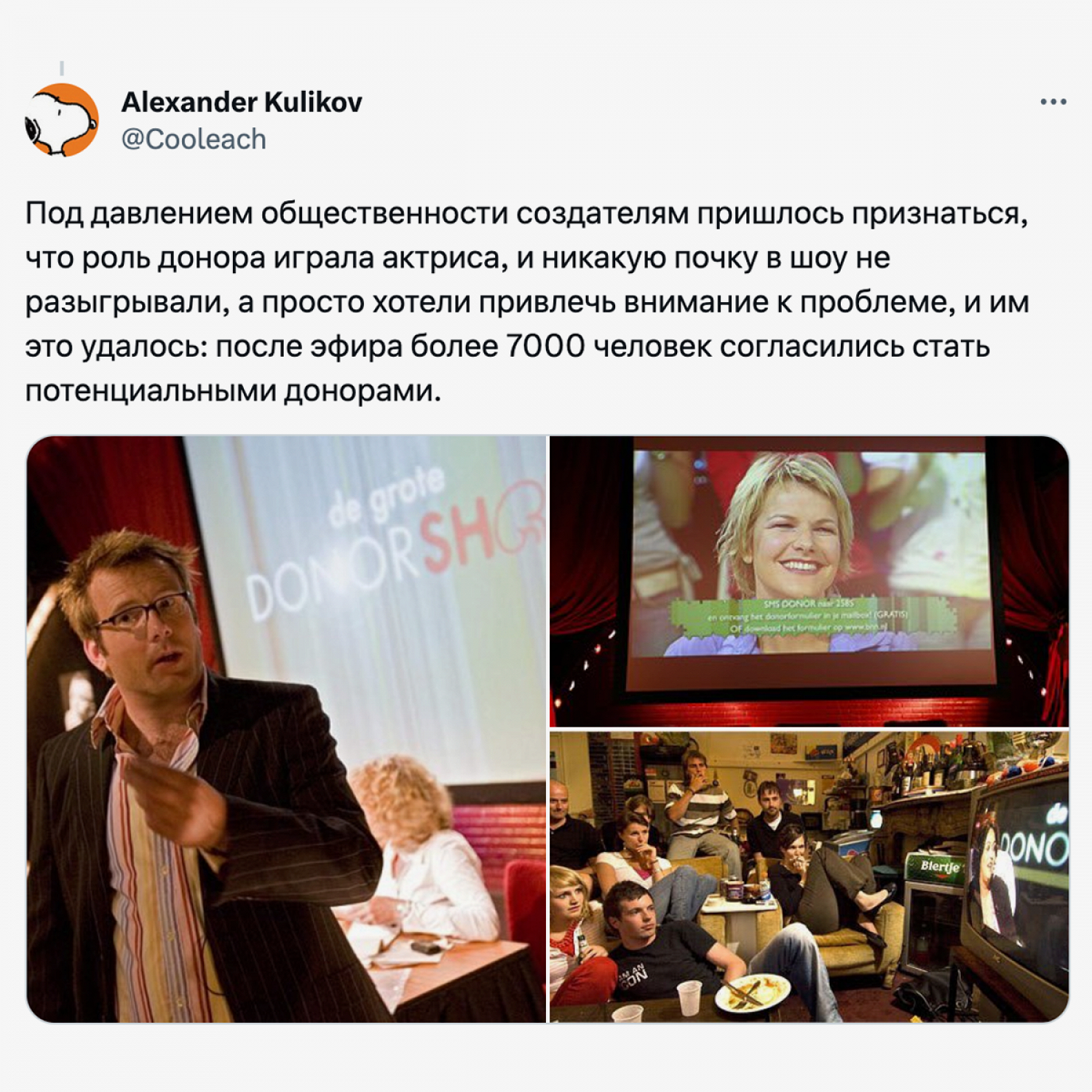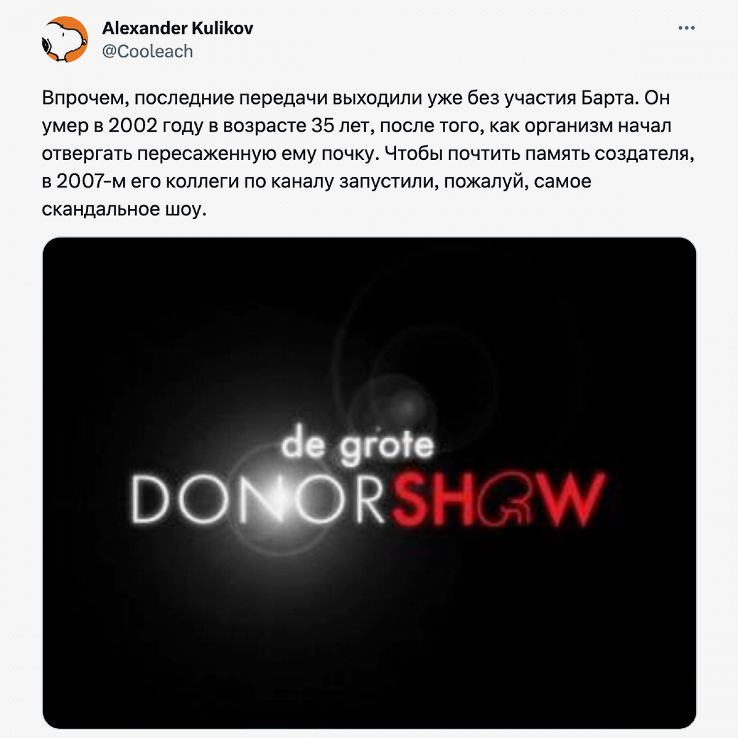 Но самой скандальной программой стало «Шоу доноров»: в нем неизлечимо больная женщина должна была выбрать среди нуждающихся кандидатов одного счастливчика, которому будет передана ее почка. Зрители голосовали за участников по СМС. Шоу позиционировалось как дань уважения Барту де Граффу, которому тоже пересаживали орган.