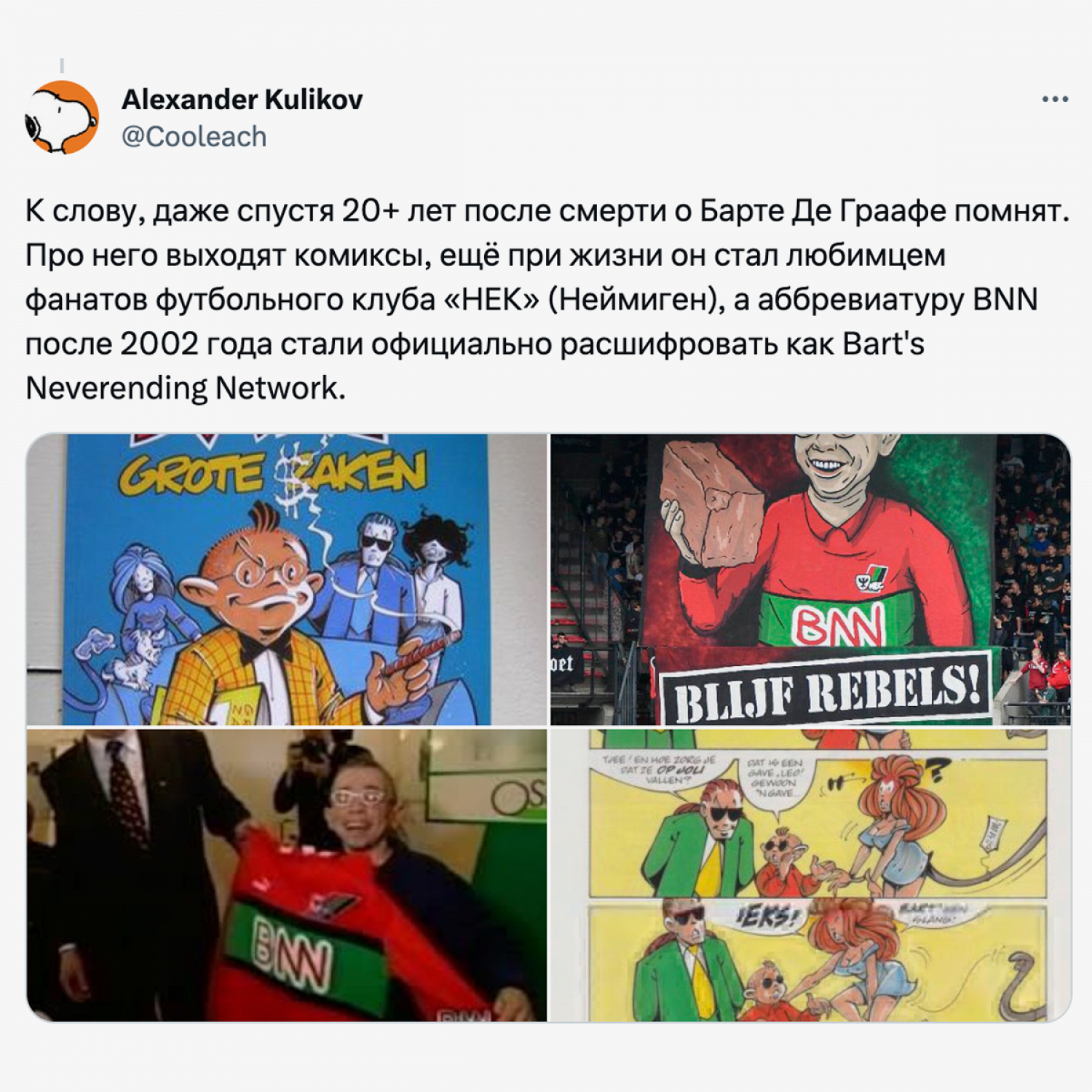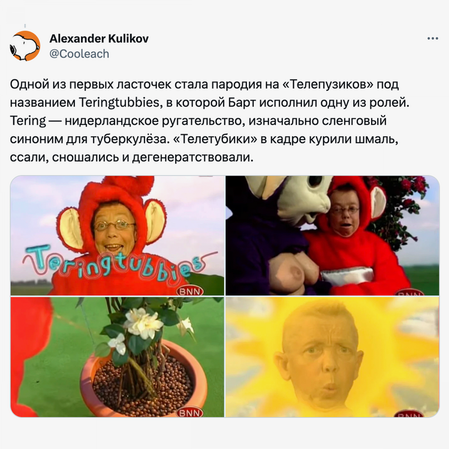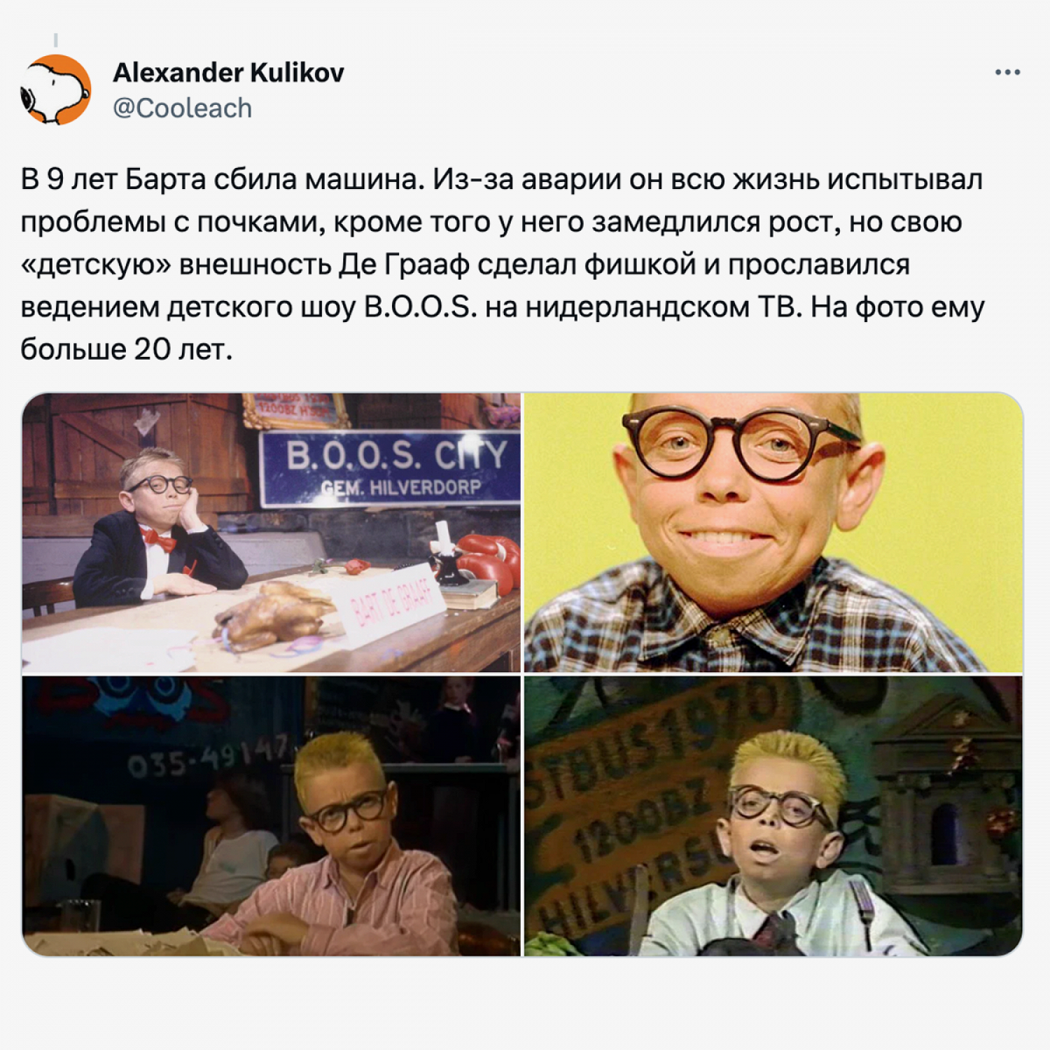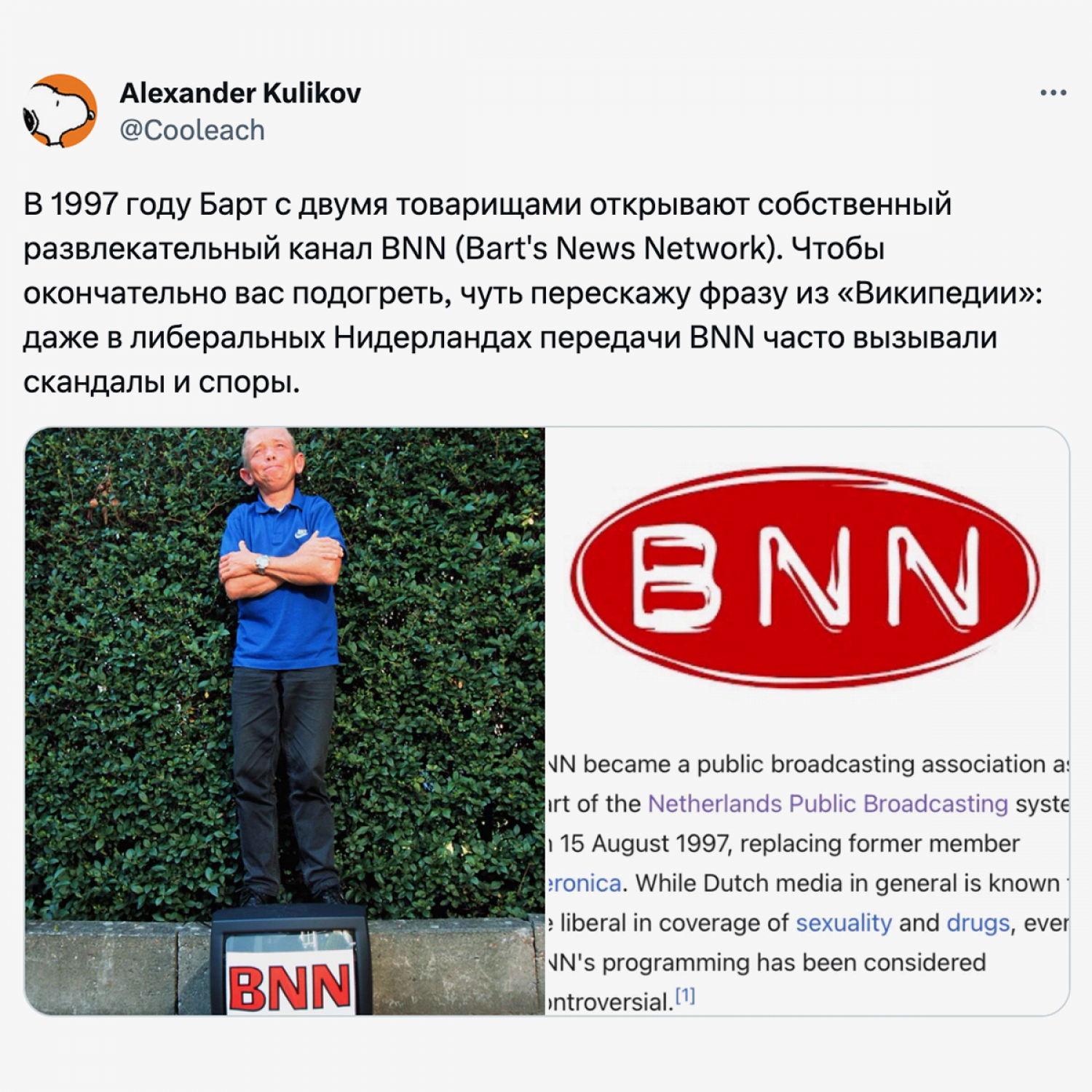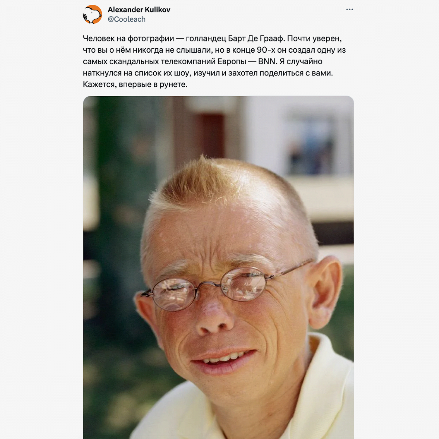 Дерзкий телеведущий с внешностью ребенка, которому все выходки сходят с рук, — таким чаще всего вспоминают Барта де Граффа. Когда ему было девять лет, он попал под машину и сломал ногу. В его организм попал редкий вирус, который поразил почки и остановил рост: до смерти в 35 лет Графф выглядел как мальчик с постепенно стареющим лицом, но все таким же маленьким телом и высоким детским голосом. Он знал, что его болезнь вряд ли позволит ему дожить до преклонных лет, а потому старался использовать каждый выпадающий на его долю шанс. «Он хотел побольше успеть за отведенное ему время, и ему это удалось — благодаря его таланту, разносторонности и особенному мышлению», — вспоминает Джерард Тиммер, соучредитель BNN. Аббревиатура расшифровывается как Bart’s News Network — «Новостная сеть Барта», так назвался канал, появившийся на голландском телевидении 1 сентября 1998 года. И выходившие на нем передачи были настолько неоднозначны и скандальны, что Граффа вспоминают до сих пор — даже спустя 21 год после его смерти.