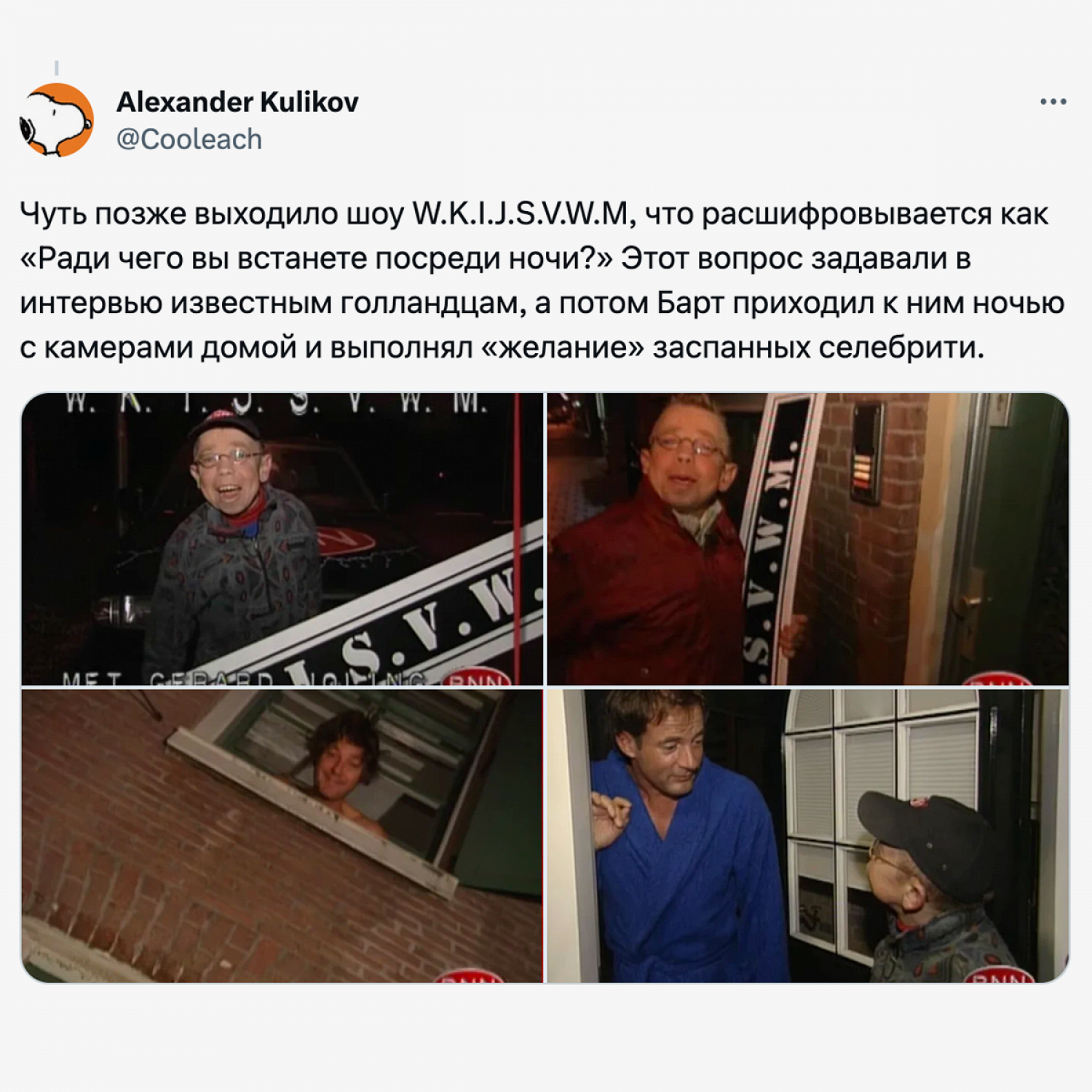 Позднее появилось шоу, название которого расшифровывалось как «Ради чего вы встанете посреди ночи?»: ведущий после полуночи со съемочной командой заявлялся в гости к голландским знаменитостям, чтобы сделать что‑то неожиданное. Например, певцу Джеральду Джолингу пришлось быстро накинуть халат, чтобы спеть во дворе в караоке.