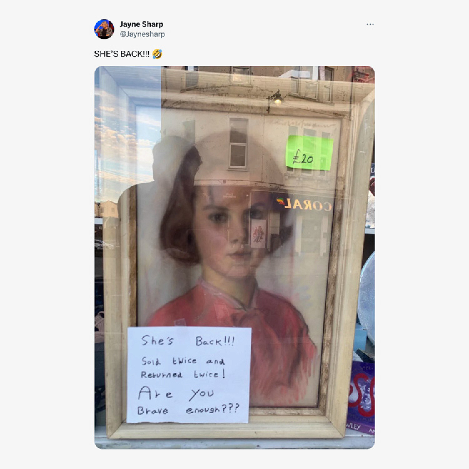 Картиной заинтересовалась еще одна покупательница, но она тоже вернула ее через три дня, и была при этом «немного расстроена». А на вопрос сотрудников магазина, почему она просто не уничтожила портрет, она ответила, что «от этого будет только хуже». Элледж вновь выставил картину — на этот раз с запиской: «Она вернулась!!! Дважды продавалась и дважды возвращалась! Ты достаточно храбр???»