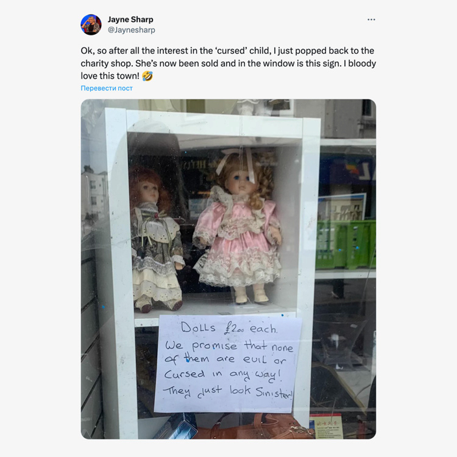 Пользовательница твиттера @Jaynesharp, которая публиковала в соцсети хронику мистического портрета, на прошлой неделе опубликовала снимок с витрины магазина: девочки со зловещим взглядом там больше нет, но выставлена коллекция кукол с запиской: «Куклы по два фунта каждая. Мы обещаем, что они не злые и не проклятые! Они просто так выглядят!»
