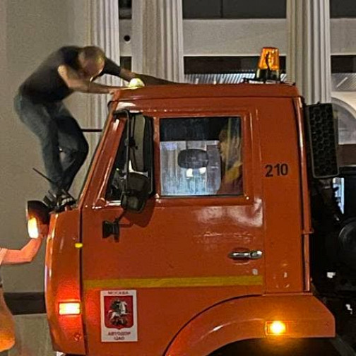 В Москве мужчина разбил лобовое стекло поливальной машины. Она случайно облила его водой