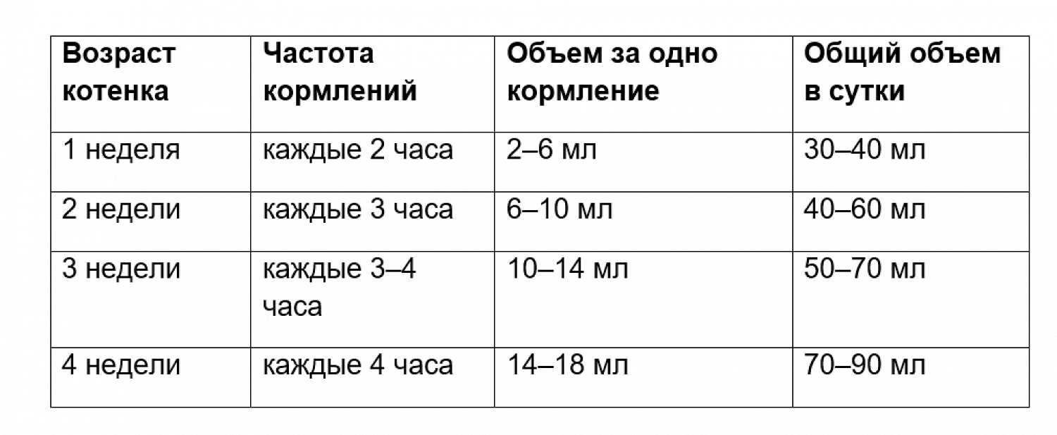 В возрасте до месяца котенка кормят каждые 2–4 часа, включая ночное время. Один прием пищи — примерно 5–10 мл смеси, в зависимости от веса. Чтобы не путаться, удобно вести таблицу: отмечать время, объем и поведение котенка после еды.