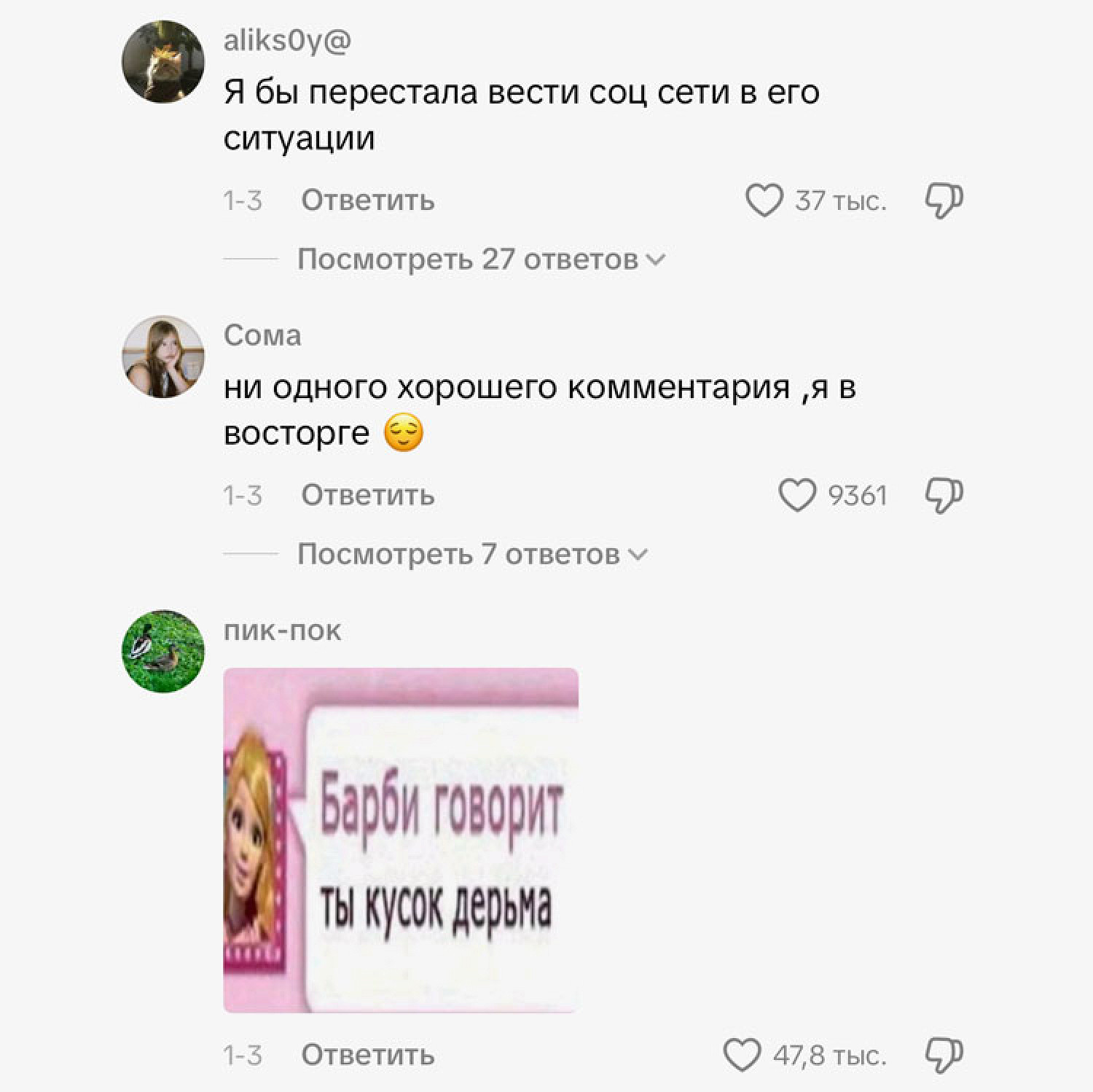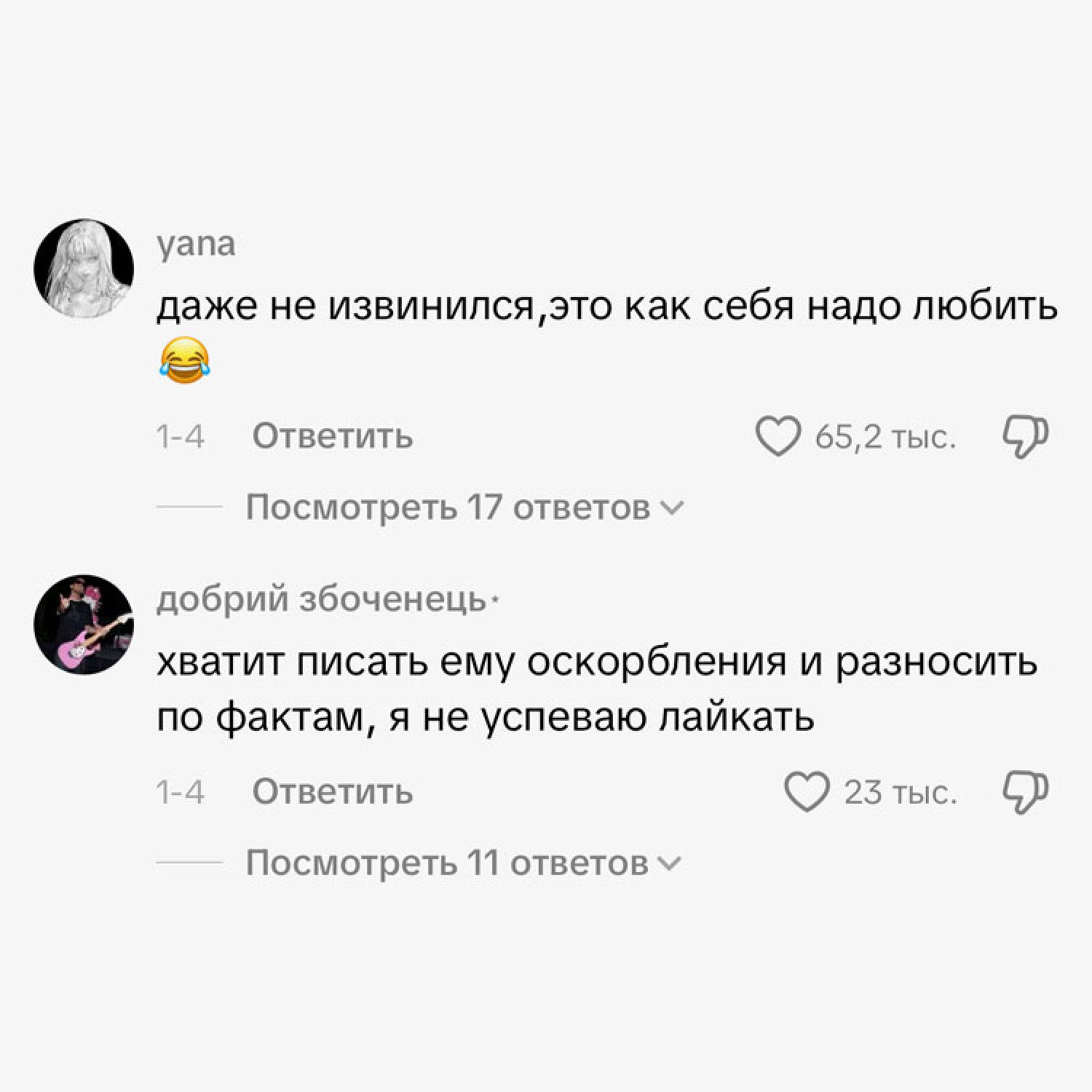 Пользователи часто выражают агрессию и к незнакомым людям, не зная их биографии и опираясь лишь на одну услышанную ими версию. А еще в тиктоке можно найти видео с советами, как отомстить партнеру за неверность. В их списке — вкалывание яиц в обивку мебели, отправка похоронных венков или передача данных о бывшем в военкомат.