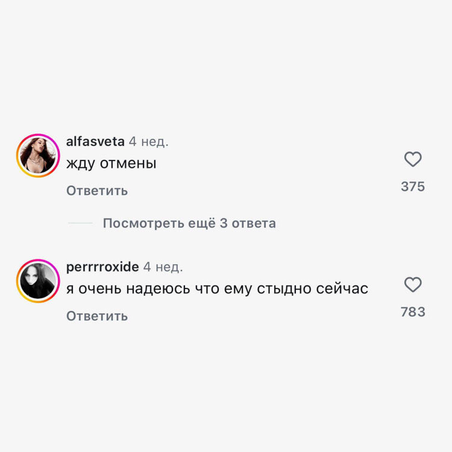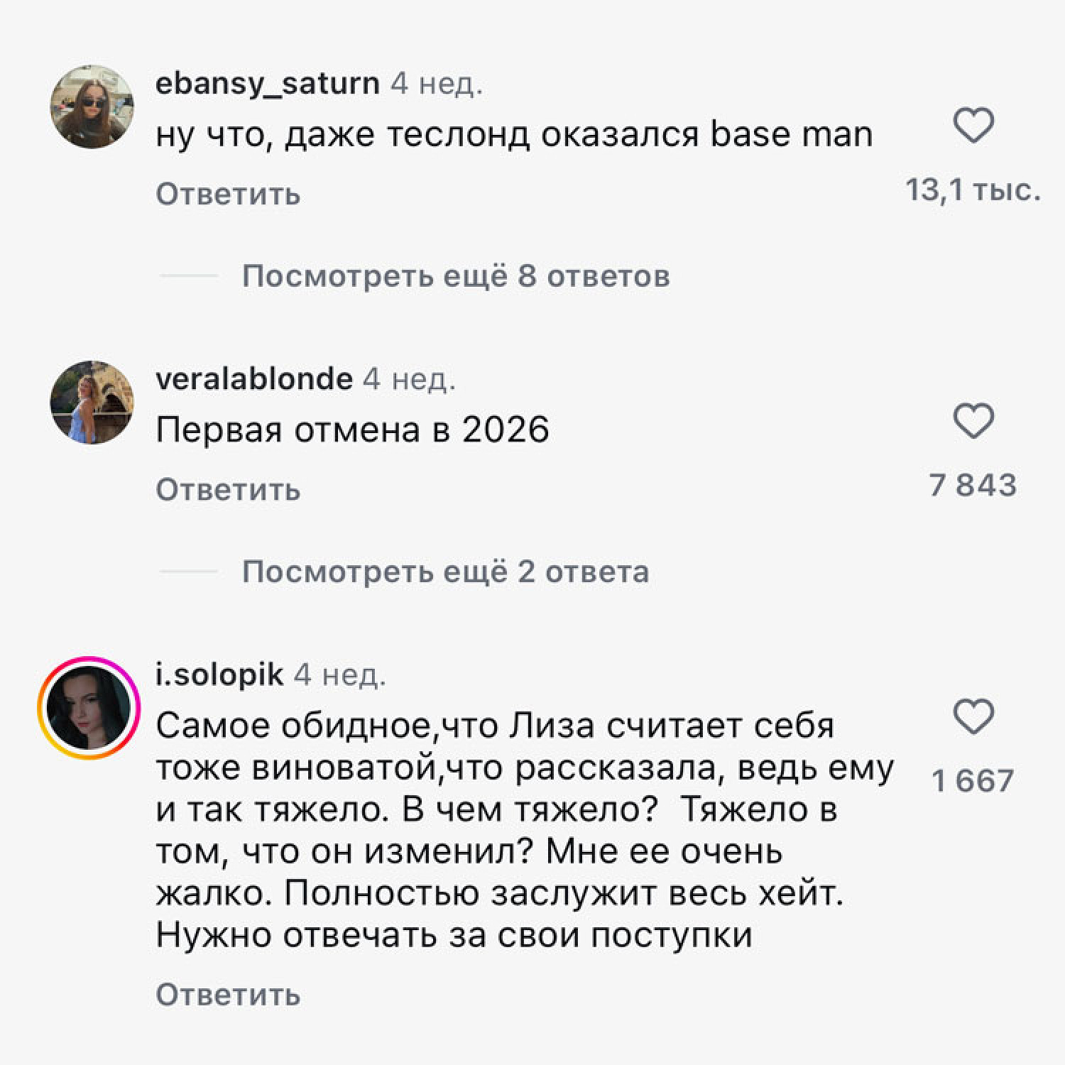 Похожая участь постигла и другого инфлюэнсера, Юлика. Он изменил Даше Каплан с их общей подругой летом 2022 года, через несколько дней после свадьбы. «Получилось как получилось. Я не выбираю, что чувствовать. Сказал день в день. Лучше так, чем врать», — прокомментировал ситуацию блогер. Помимо кучи хейта (который достался и разлучнице Мармарис), он столкнулся с потерей аудитории. До сих пор под совместными публикациями Маши Мармарис и Юлика люди вспоминают эту историю. Забавное стечение обстоятельств: Саша Теслонд в 2022-м осудил своего коллегу по цеху и призывал распространять хештег «Юлик ***** [мудак]».