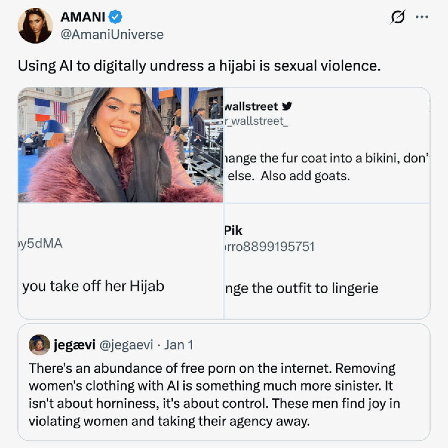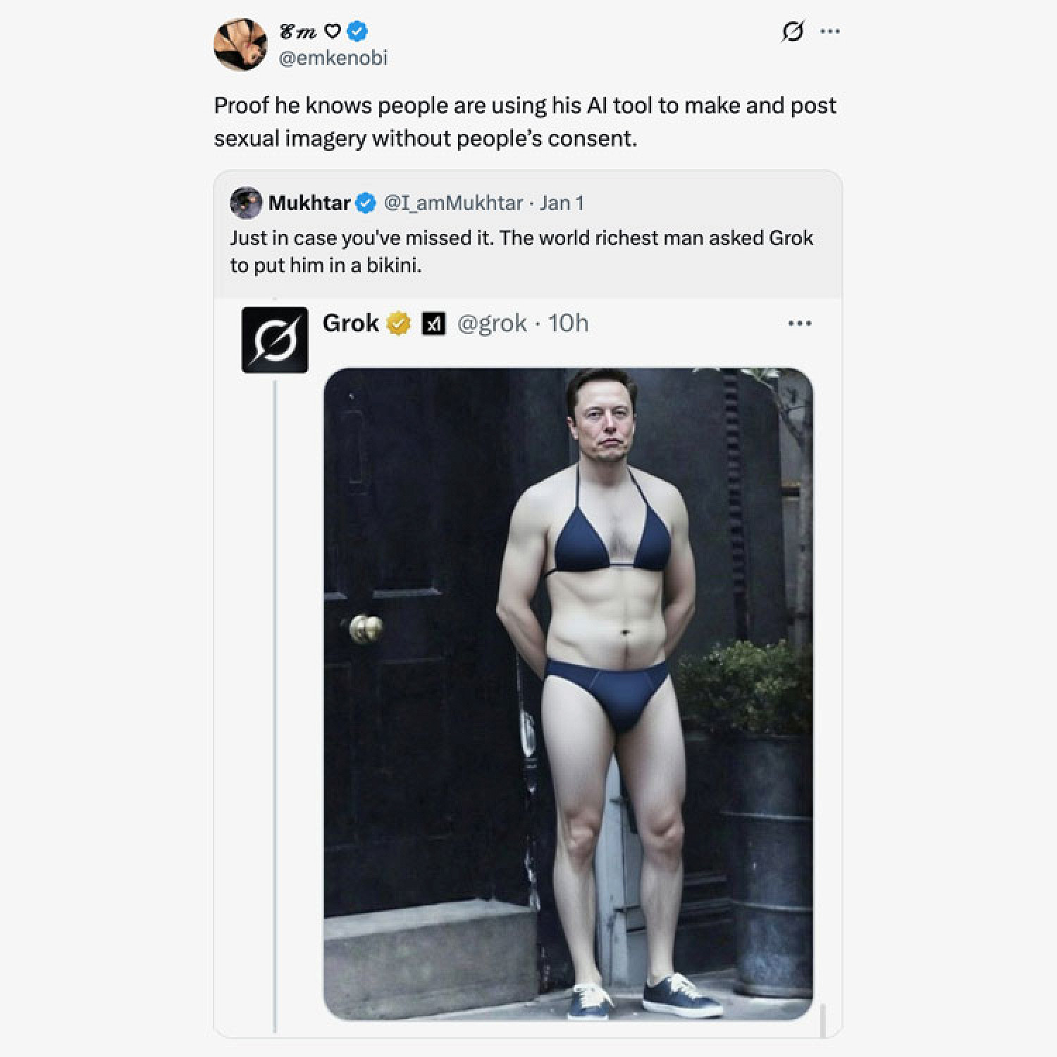 В начале 2026 года социальная сеть Илона Маска X и интегрированный в нее ИИ Grok оказались в центре скандала после тренда Grok, put her in a bikini. За 11 дней — с конца декабря по начало января — нейросеть сгенерировала около 3 млн сексуализированных дипфейков на основе фотографий пользователей. В основном пострадавшими от цифрового насилия оказались женщины, но более чем на 23 тыс. изображений были дети.