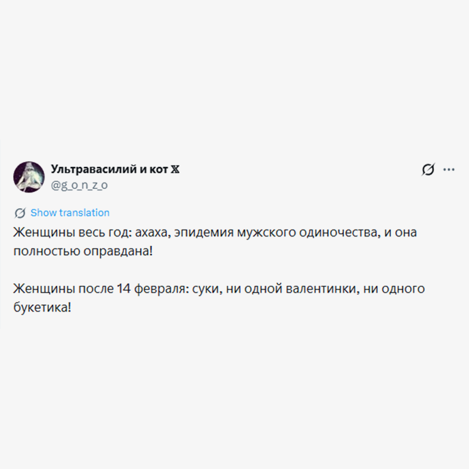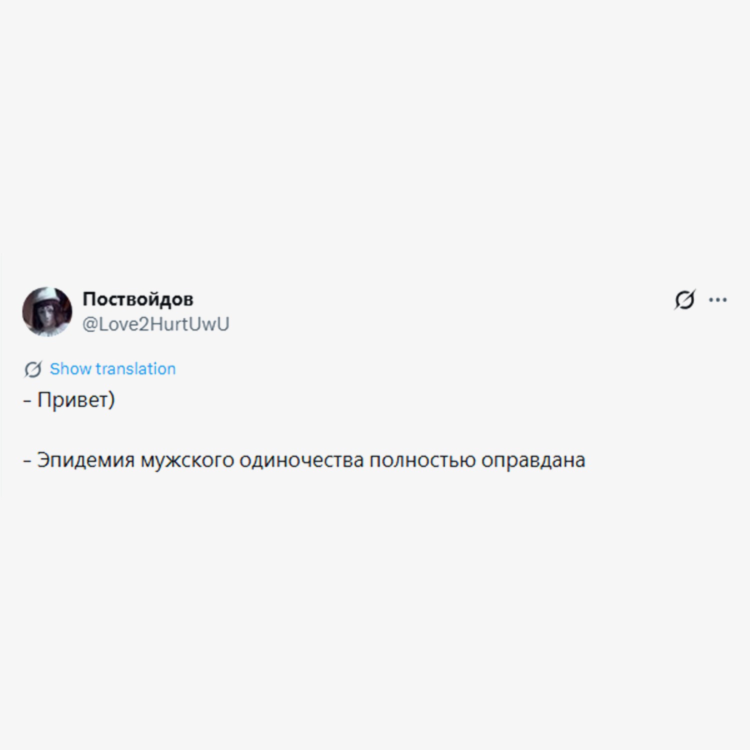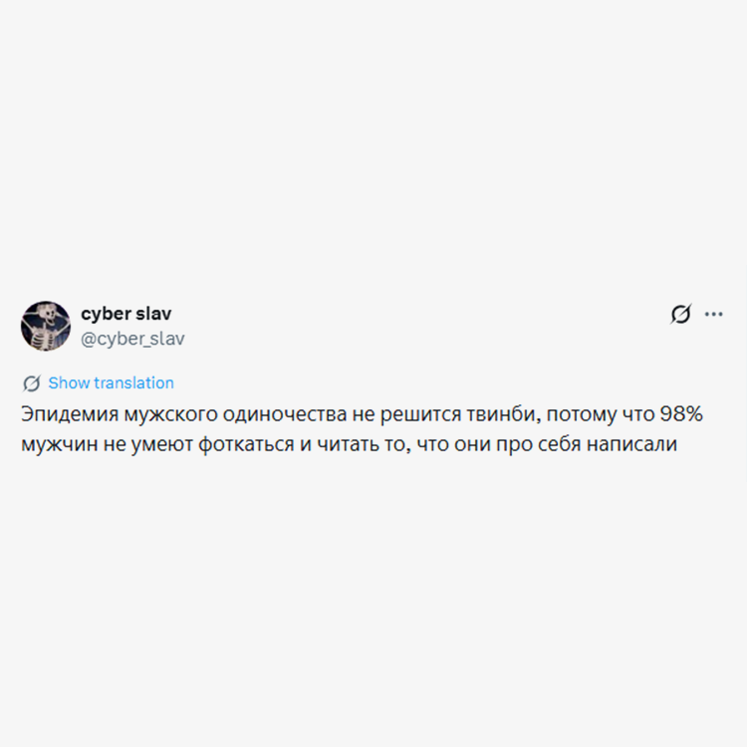 Пока представители маносферы бьют тревогу, остальной интернет говорить об эпидемии скорее иронично. «Эпидемия мужского одиночества полностью оправдана» — часто добавляют к скриншотам с идиотским поведением мужчин в дейтингах. «Мужчин недостаточно коснулась проблема мужского одиночества» — сказала мне подруга, когда я написал, что ищу героев для этого текста. В похожем ключе говорил будущий мэр Нью-Йорка Зохран Мамдани на подкасте Boy Problems, когда его спросили, что он собирается делать с эпидемией мужского одиночества. Мамдани ответил, что решение этой проблемы — задача самих мужчин, но все же пообещал заботиться о создании бесплатных и доступных городских пространств, которые смогут стать точкой притяжения для одиноких людей