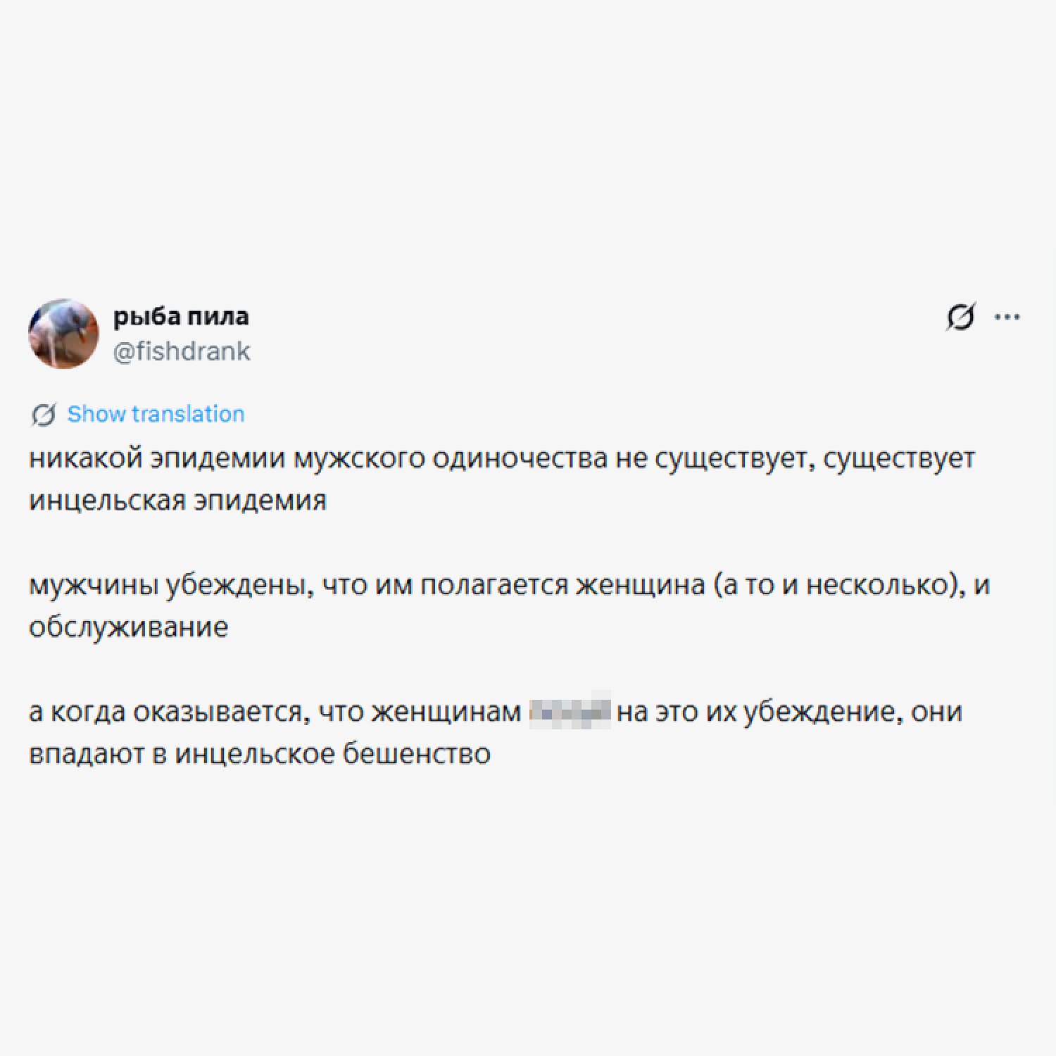 Если попробовать поискать информацию об «эпидемии мужского одиночества» в сети, можно обнаружить, что внушительное количество блогов и каналов о «мужской псхихологии» или саморазвитии взваливают ключевую вину за эту «эпидемию» на женщин. Их обвиняют в том, что они слишком много требуют от мужчин, не предлагая моральную поддержку и даже обвиняют в «финансовом насилии» и «психо-эмоциальном» терроре. Причем зачастую верное диагностирование проблемы (давление гендерных ролей, невозможность быть «добытчиком» в современных экономических условиях) в маносфере часто предполагает невозможное решение — возвращение в «золотой век», когда мужчины «были мужчинами».