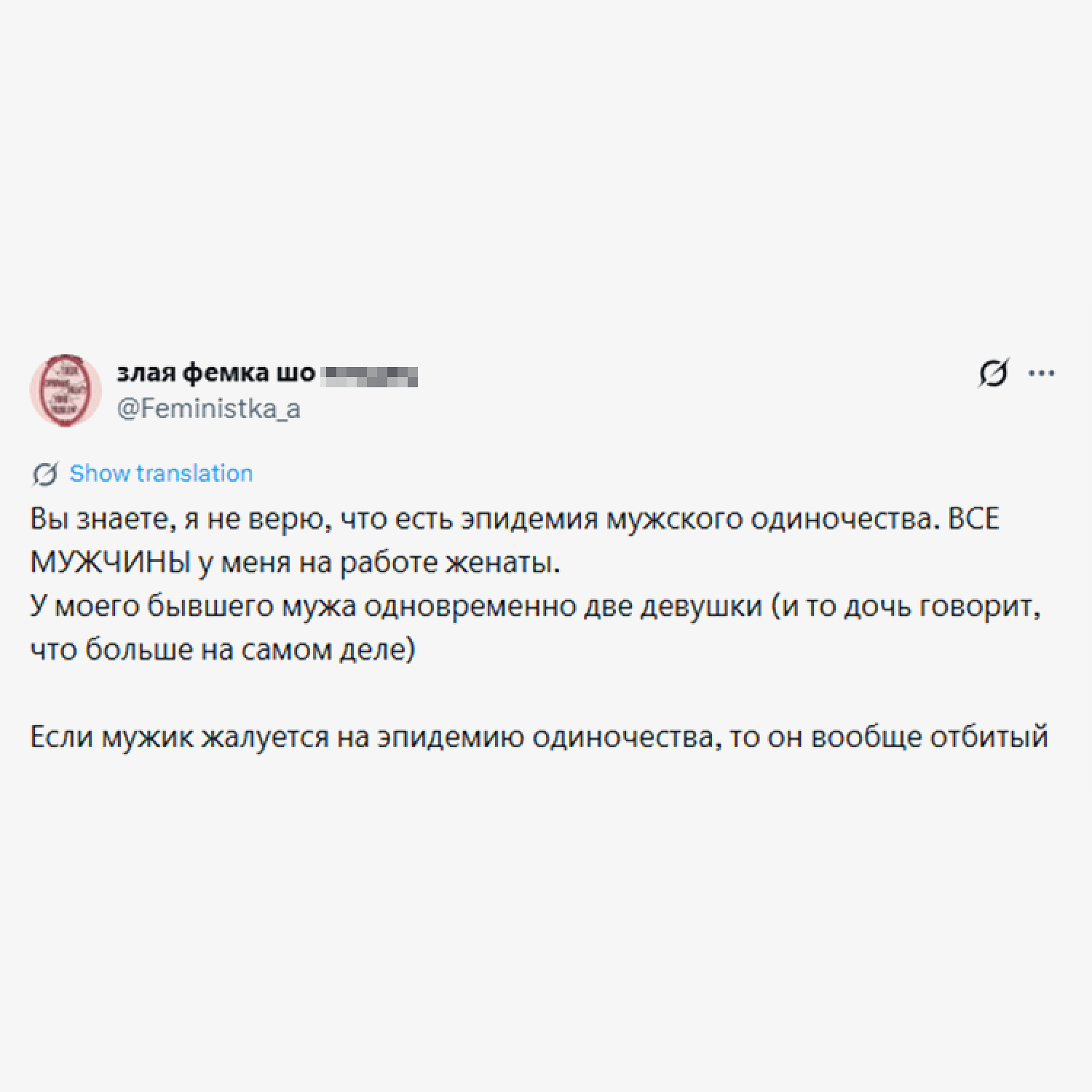 «Так называемая „эпидемия мужского одиночества“ — скорее медиаконструкция, чем корректный социальный диагноз. Речь не идет о внезапном росте одиночества именно среди мужчин, а о том, что меняется социальный контекст: трансформируются гендерные роли, разрушается привычная модель мужской идентичности, построенной на доминировании, экономической функции и эмоциональной закрытости. В этих условиях становится заметнее то, что раньше было замаскировано иерархией власти и социальным требованием брака.