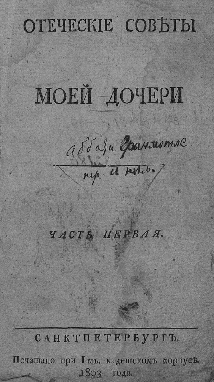 Параллельно появлялись прямые инструкции по воспитанию. Их авторами чаще всего были мужчины — например, педагоги и священники — и, как пишет филолог Евгения Лекаревич, говорили с позиции отцовского, религиозного или монаршего авторитета. Немецкий педагог Генрих Кампе в «Отеческих советах моей дочери» писал, что задача книги — раскрыть дочери «особенное ее определение — определение женщины». Излишняя ученость, по его мнению, опасна: «зараза учености» и «излишняя охота к чтению» губили здоровье девушек и «премногие фамилии».