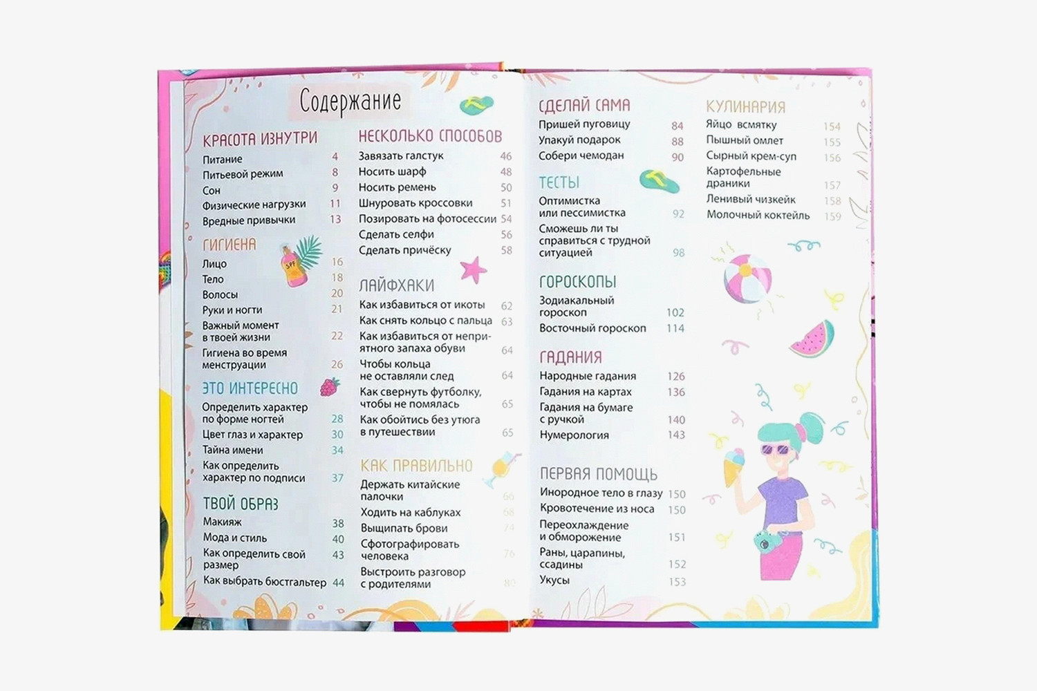 Многотысячными тиражами в книжных магазинах и на маркетплейсах продается «Энциклопедия современной девчонки» издательства «Буква Ленд», впервые вышедшая в 2022 году и уже несколько раз переизданная. На 160 страницах рассказывается, как правильно выщипывать брови и выбирать бюстгальтер, делать идеальное селфи и пришивать пуговицу; есть разделы о кулинарии, первой помощи, гороскопах и гаданиях. При этом тем вроде выбора профессии или финансовой грамотности в книге почти нет — хотя на обложке обещают «всю необходимую современной девчонке информацию».